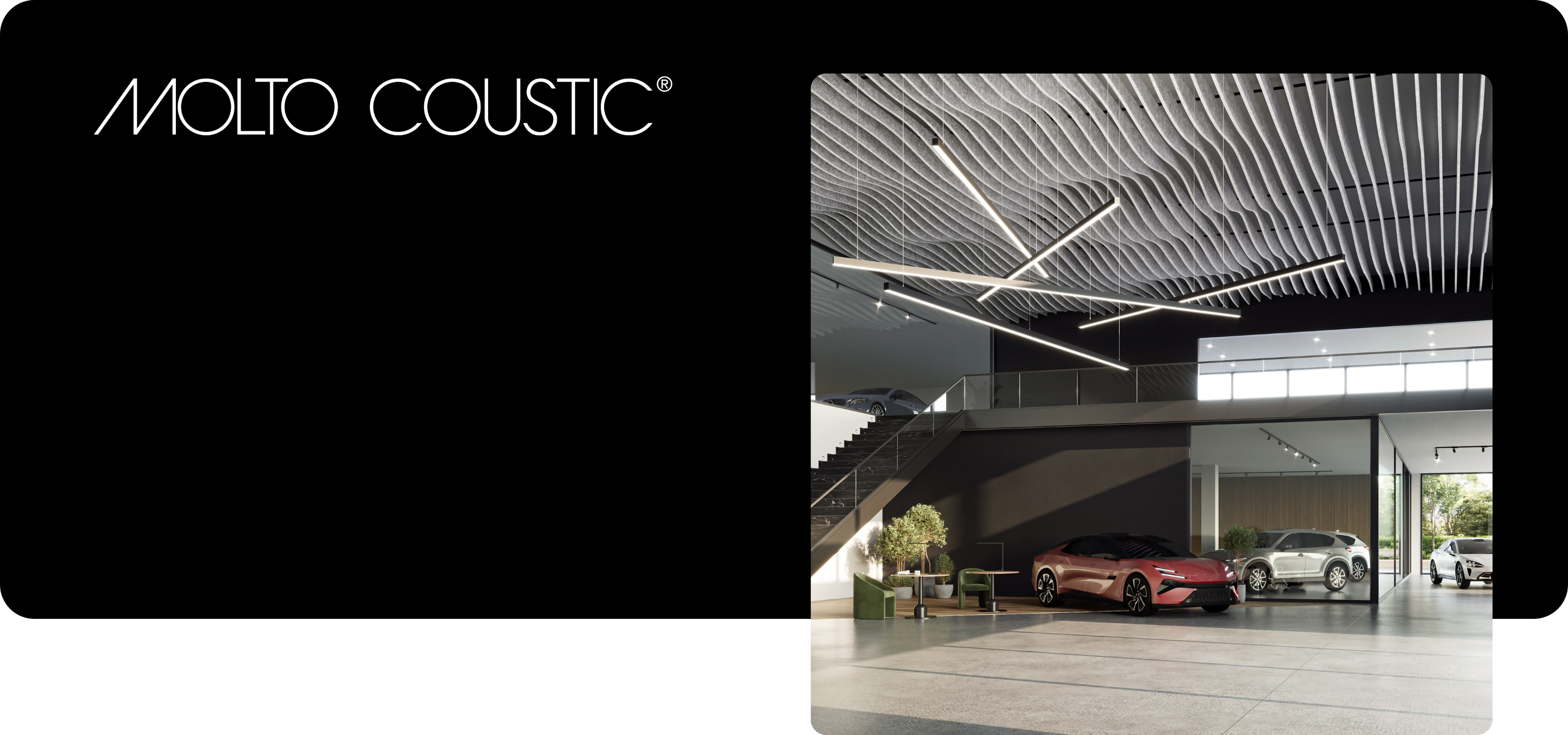 Molto Luce enhances its acoustic solutions with specially coordinated lighting inserts that perfectly meet both acoustic and visual requirements. These well-conceived combinations not only ensure excellent acoustic conditions but also create atmospheric highlights through precise lighting design. With comprehensive expertise in high-quality lighting, innovative concepts emerge that seamlessly integrate acoustics and light. The result: holistic solutions that enhance spaces both functionally and aesthetically.