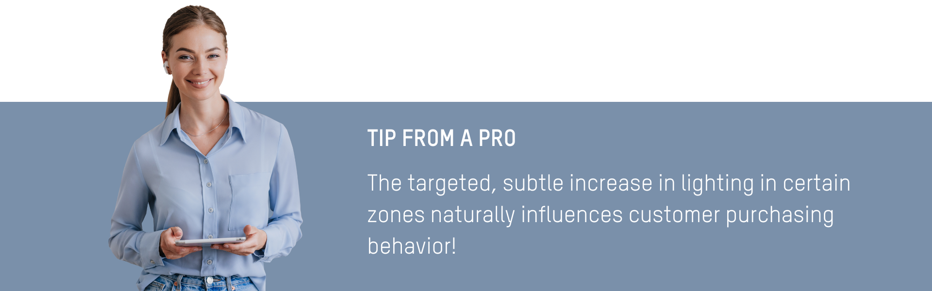 Its precise light distribution provides 1000 lx on walls and 500 lx on floors – perfect for highlighting products, artworks, or architectural details.