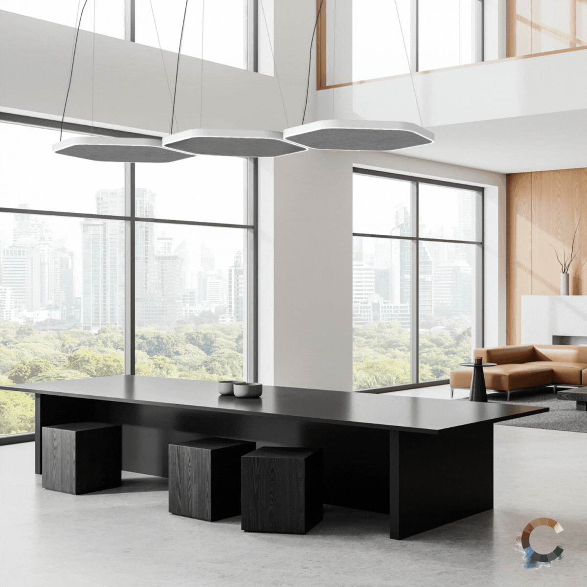 Design spaces with style and functionality using two sizes and shapes of the LON pendant luminaires in a minimalist design of 16 x 52 mm. The identical design of the lights and acoustic panels allows you to harmoniously combine lighting and acoustics, creating a pleasant sound atmosphere.